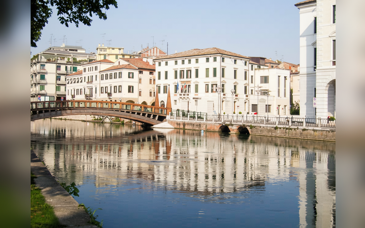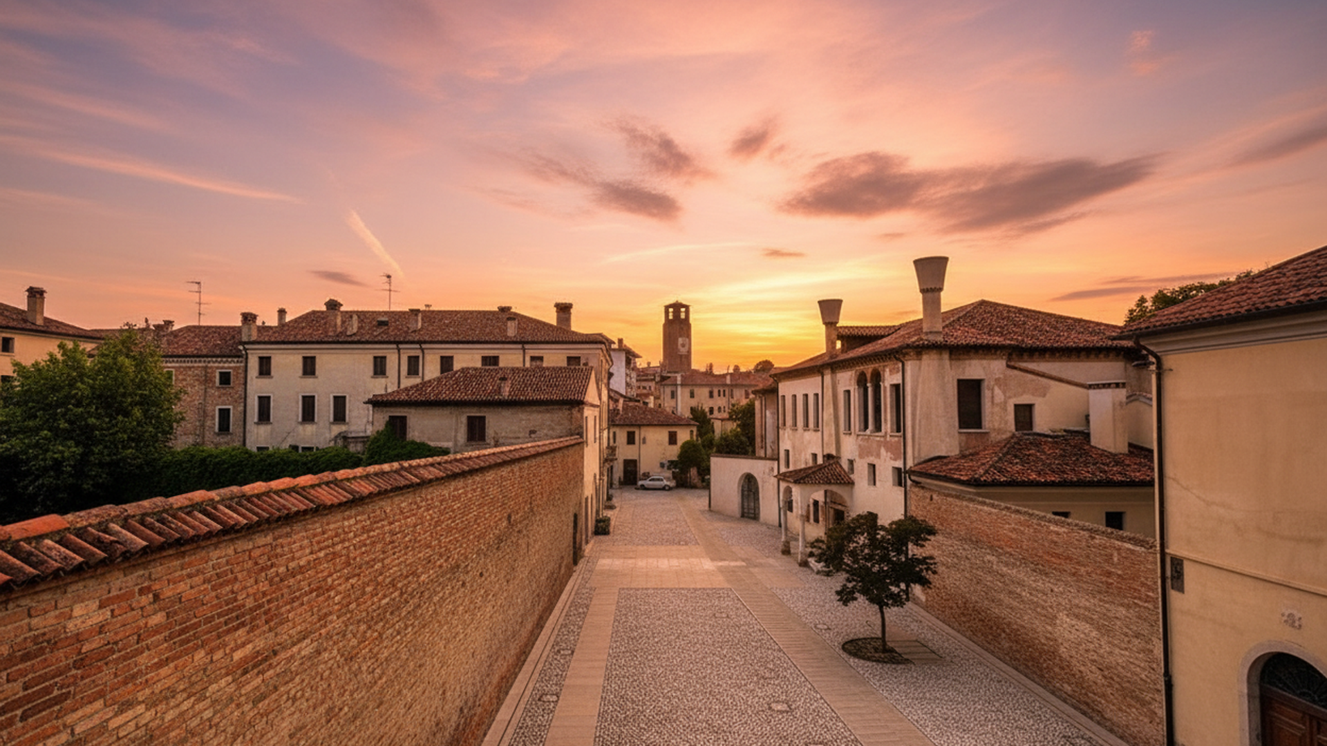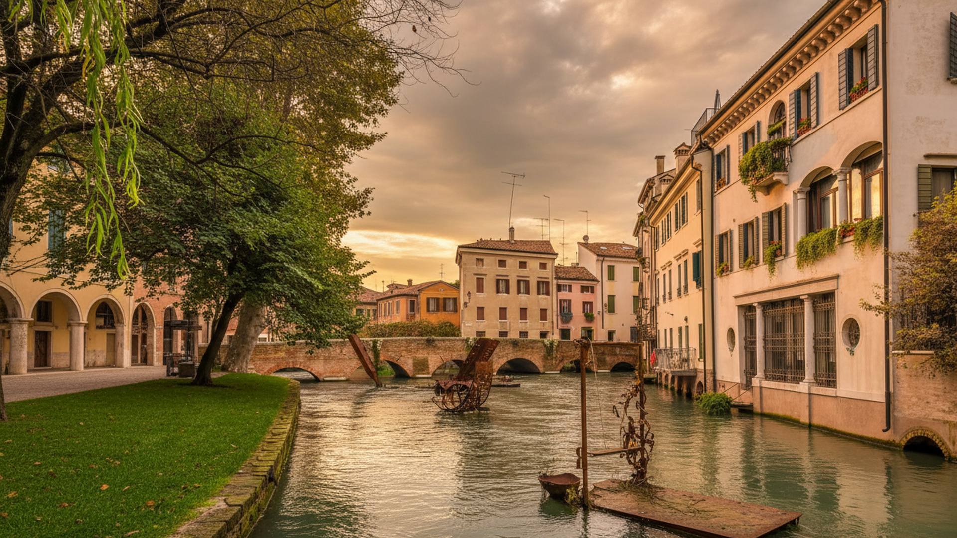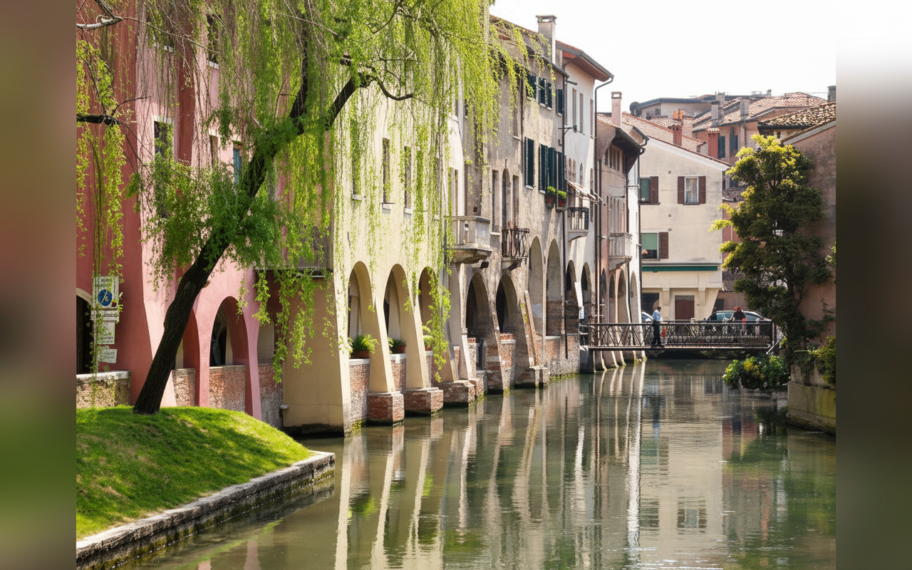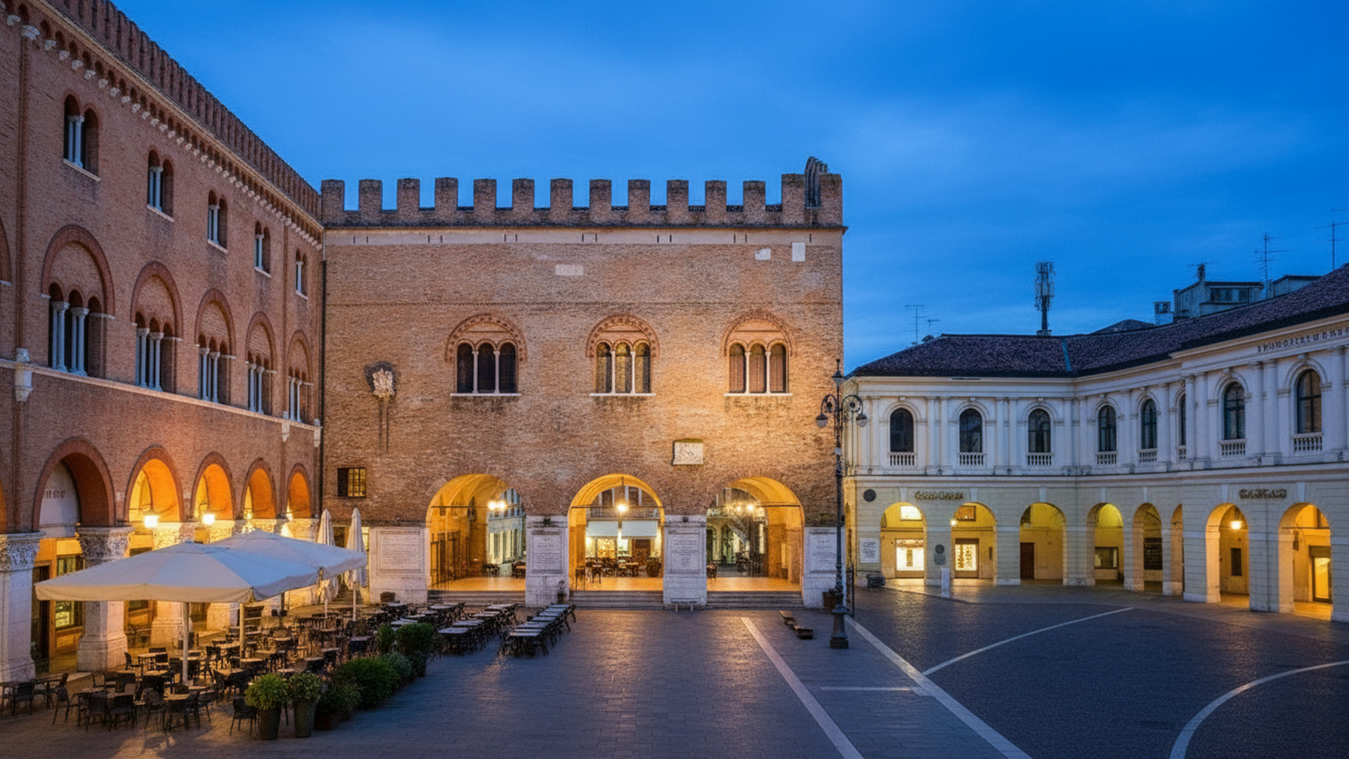 La piazza principale di Treviso, circondata da edifici storici e caffè, cuore pulsante della vita cittadina.