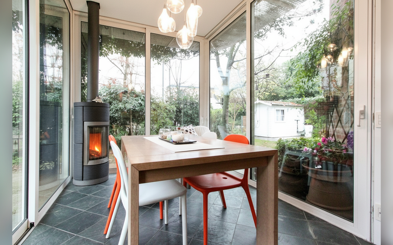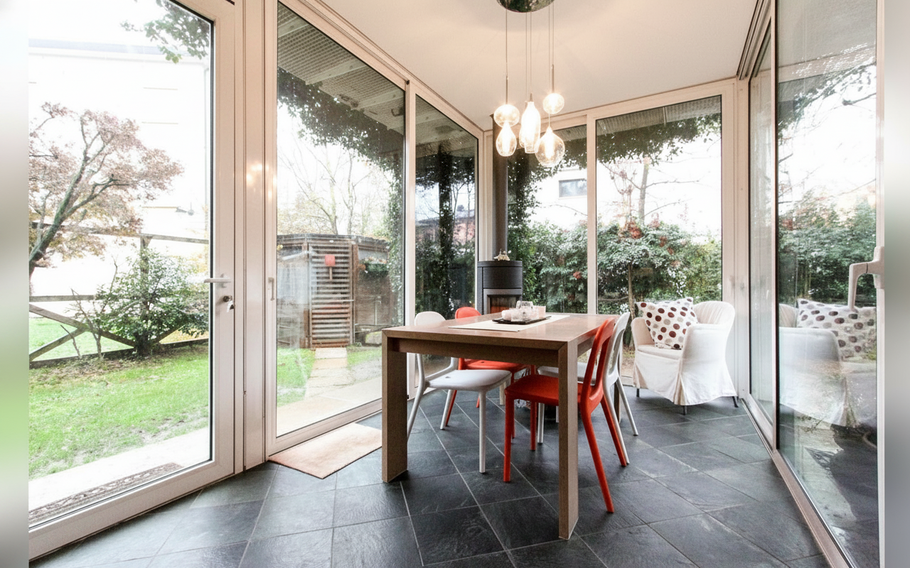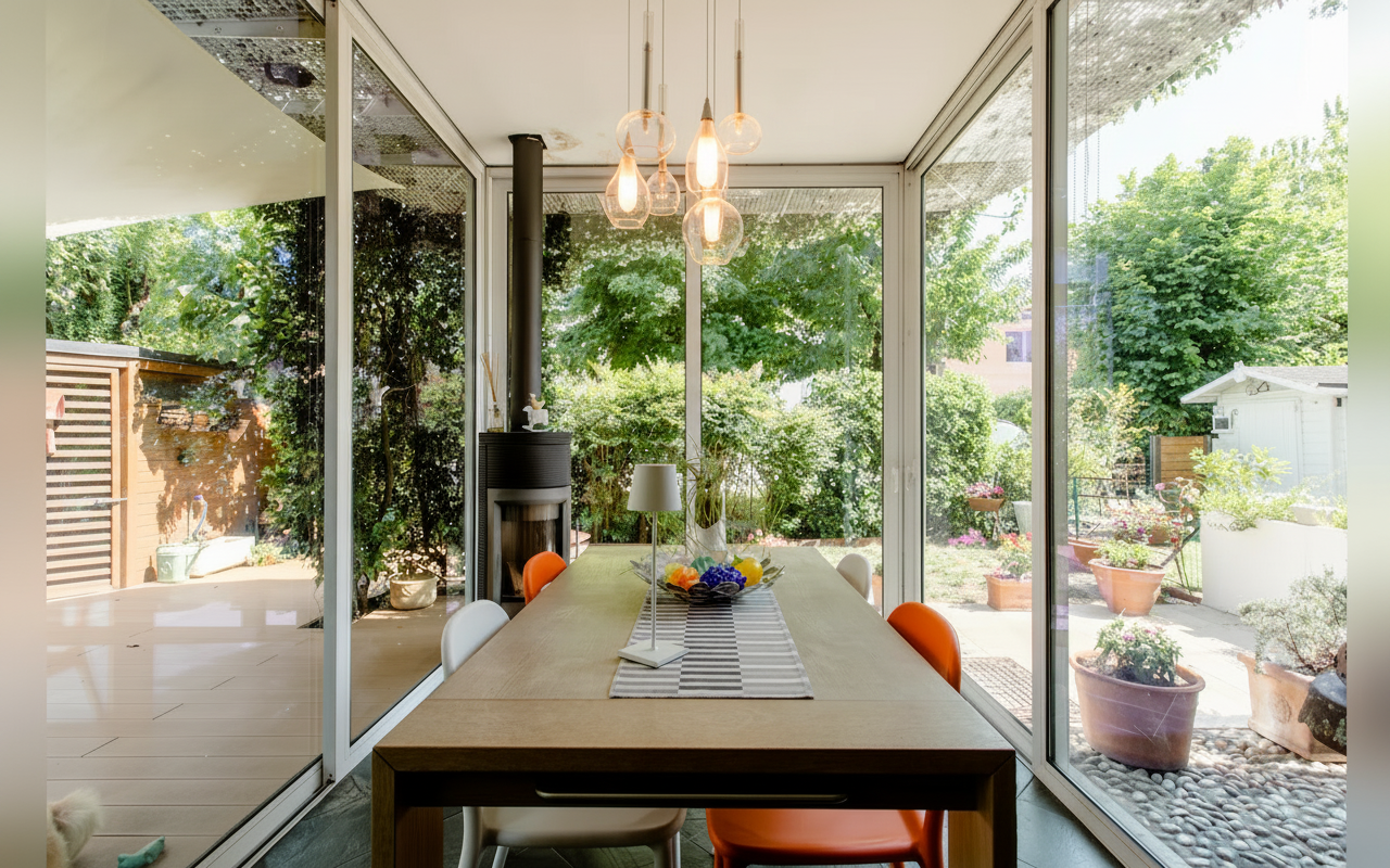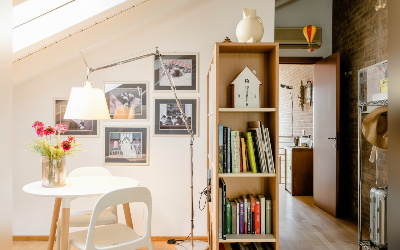 Mansarda luminosa con travi in legno a vista, composta da un letto matrimoniale e un letto singolo, bagno privato, divano e TV. Ideale per coppie o piccoli gruppi fino a 3 persone, offre un ambiente intimo e confortevole nel cuore di Treviso. Accesso anche a una veranda per colazione e a un giardino privato all'esterno, per momenti di relax e convivialità.